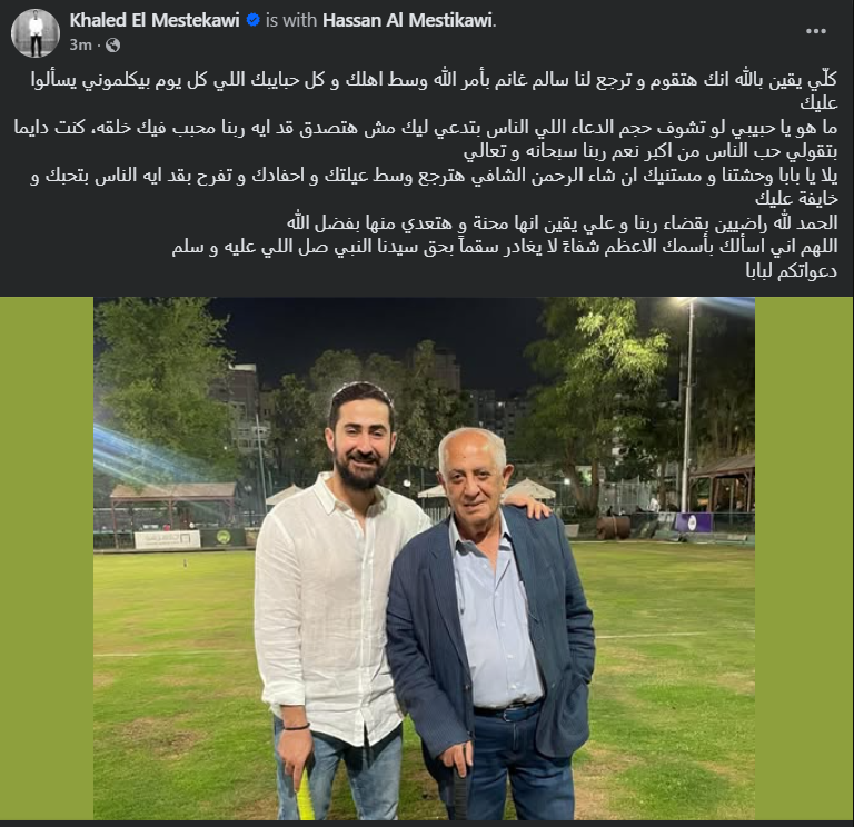 وتابع قائلاً:”ما هو يا حبيبي لو تشوف حجم الدعاء اللي الناس بتدعي ليك مش هتصدق قد ايه ربنا محبب فيك خلقه، كنت دايما بتقولي حب الناس من اكبر نعم ربنا سبحانه و تعالي، يلا يا بابا وحشتنا و مستنيك ان شاء الرحمن الشافي هترجع وسط عيلتك و احفادك و تفرح بقد ايه الناس بتحبك و خايفة عليك”.